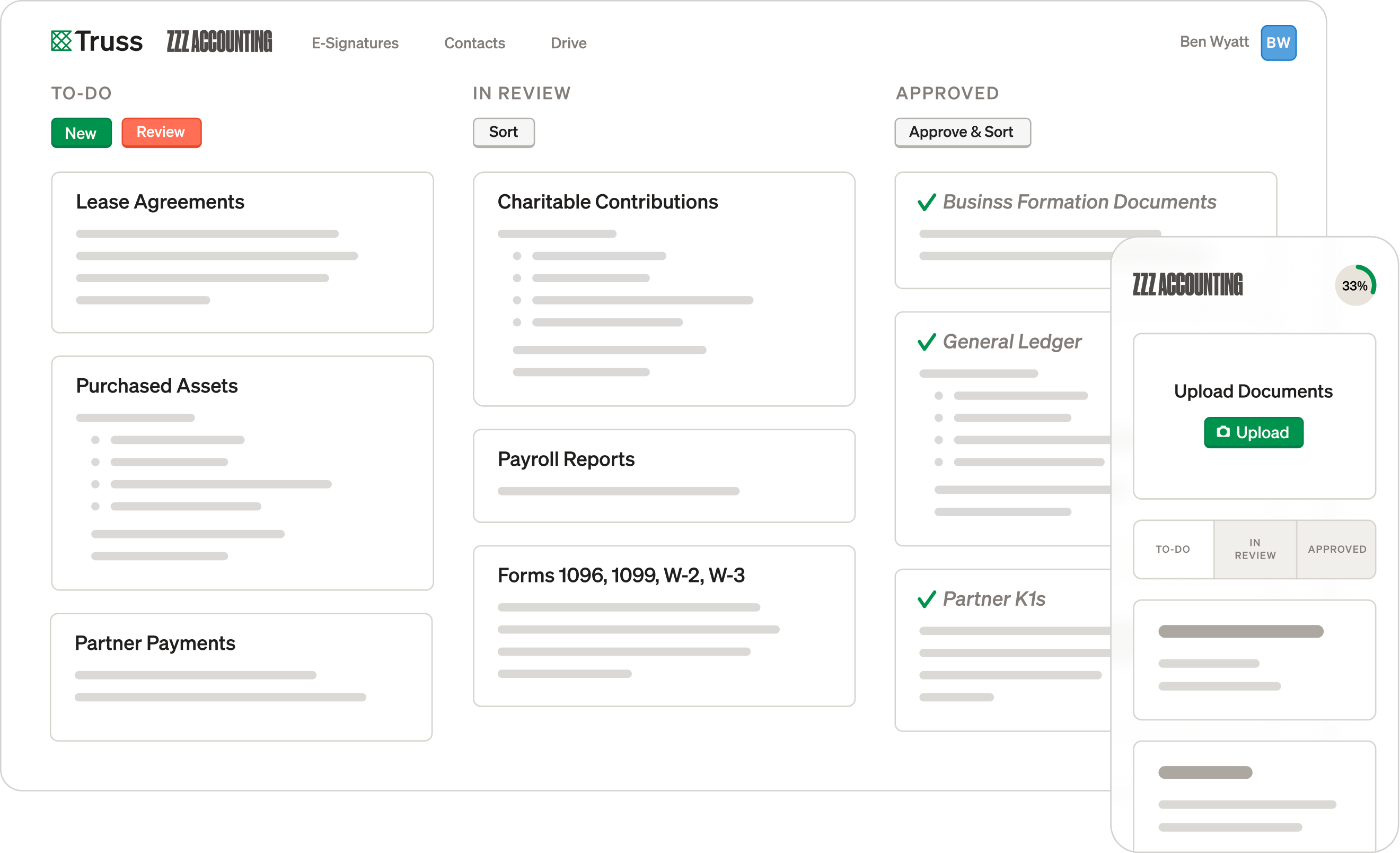 Open one clean view of your season. Engage clients with zero-login links and AI checklists so clients provide the right docs fast. Uploads convert to PDF, auto-rename, and file themselves — from the same screen you request, assign, and nudge — all protected by SOC 2/AES-256 with a full audit trail.